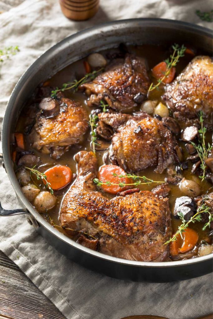 A classic French dish with tender chicken, red wine, bacon, and herbs — rich, rustic, and full of flavour.