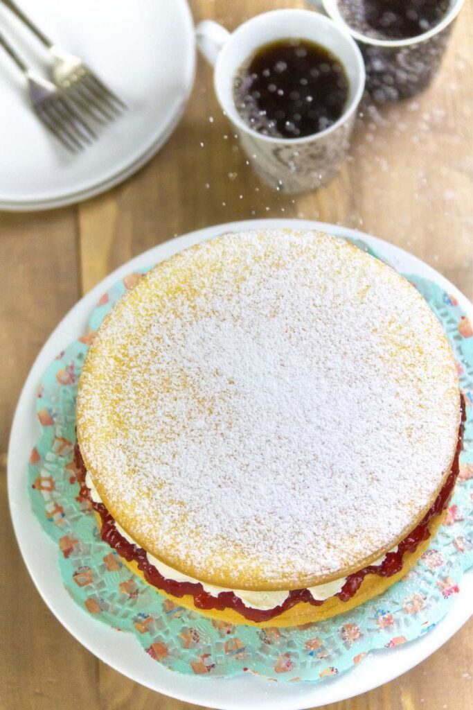 Spread one sponge with jam, lemon curd, or whipped cream — whatever you fancy. Plop the second sponge on top, and dust with icing sugar like it’s snowing. That’s it. Make a cup of tea and dig in.