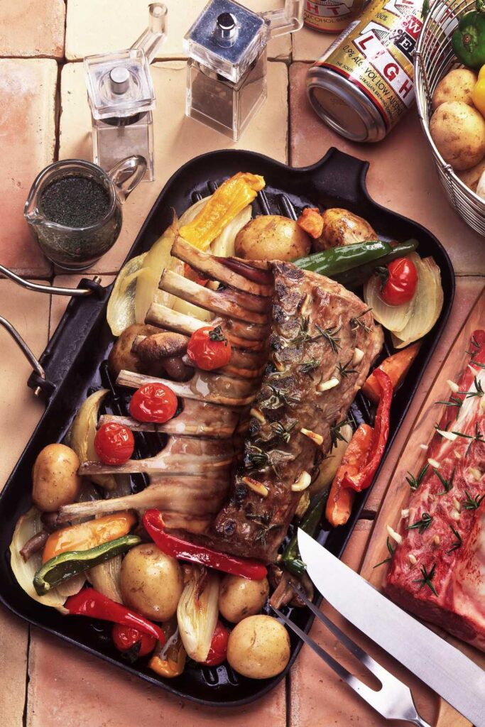 Pop a wire rack over the veg (or rest the lamb directly on top if you don’t have one — no stress). Rub the lamb with salt, pepper, and rosemary, then place it gently on the rack.
