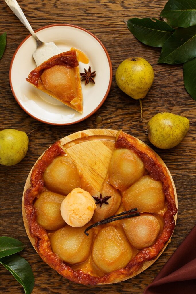 Sticky-sweet caramelized pears tucked under golden puff pastry — warm, fragrant, and best served with melting scoops of vanilla ice cream.
