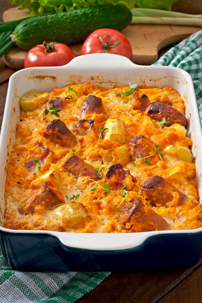 A warm, rustic casserole of golden sausages, apples, and bacon in a rich tomato sauce — comfort food at its finest.