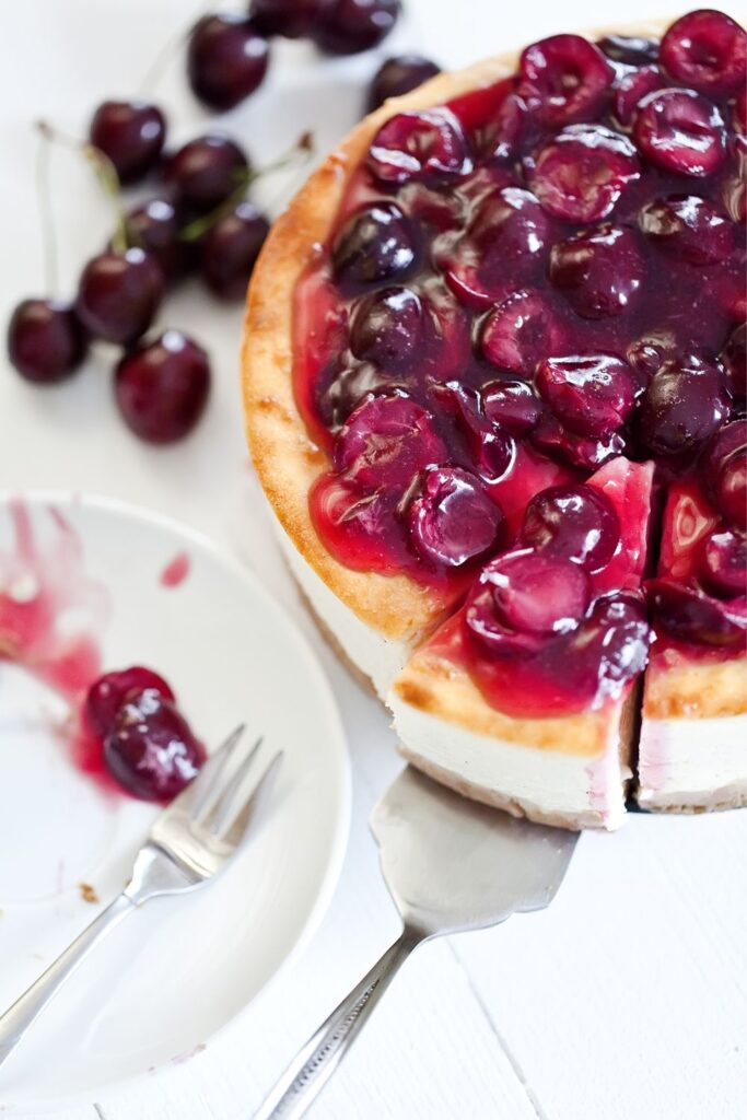 - Slice cheesecake and spoon cherries on top.