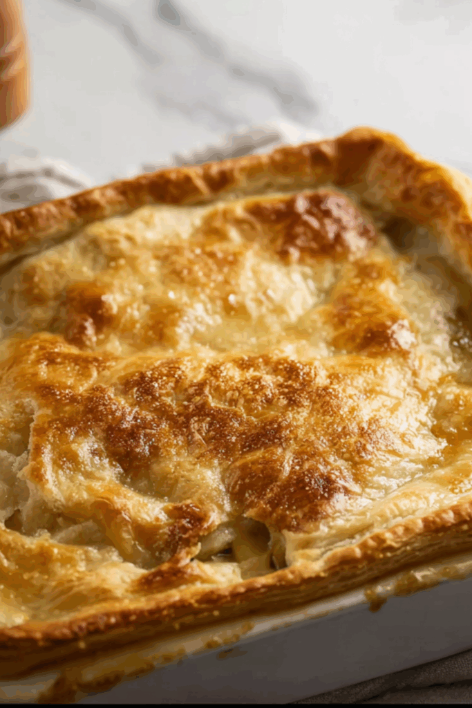 A golden, flaky-topped chicken pie filled with creamy herbed gravy, tender chicken, and veggies — like a warm blanket in food form.