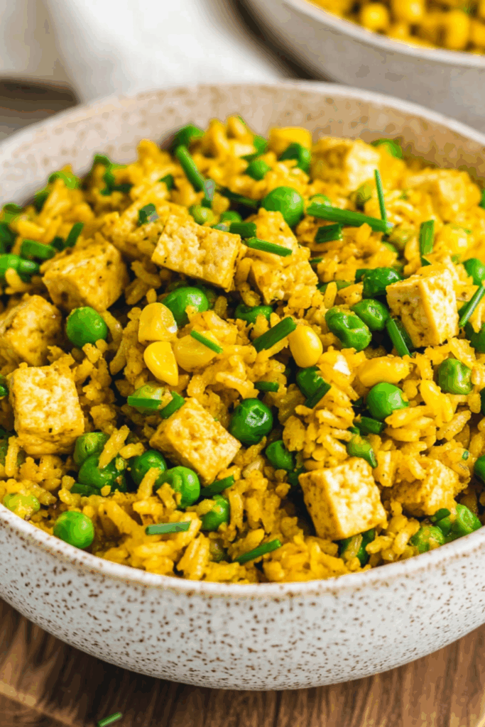 But this — this gloriously golden, sesame-slicked tofu fried rice — is the little miracle I keep coming back to. It started as a lazy Tuesday experiment inspired by Jamie Oliver’s “5 Ingredients” mantra, and ended as a weekly staple I actually look forward to. It’s comforting, savoury, just enough spice to wake things up — and best of all, you make it with whatever odds and ends you’ve already got. Frozen peas? Sure. Leftover rice from takeaway? Even better.