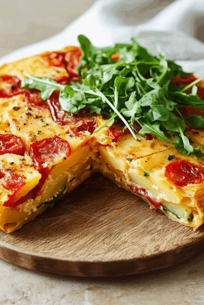 A rustic, golden tortilla frittata packed with soft potatoes, sweet red peppers, and peppery watercress — cosy, satisfying, and totally fuss-free.
