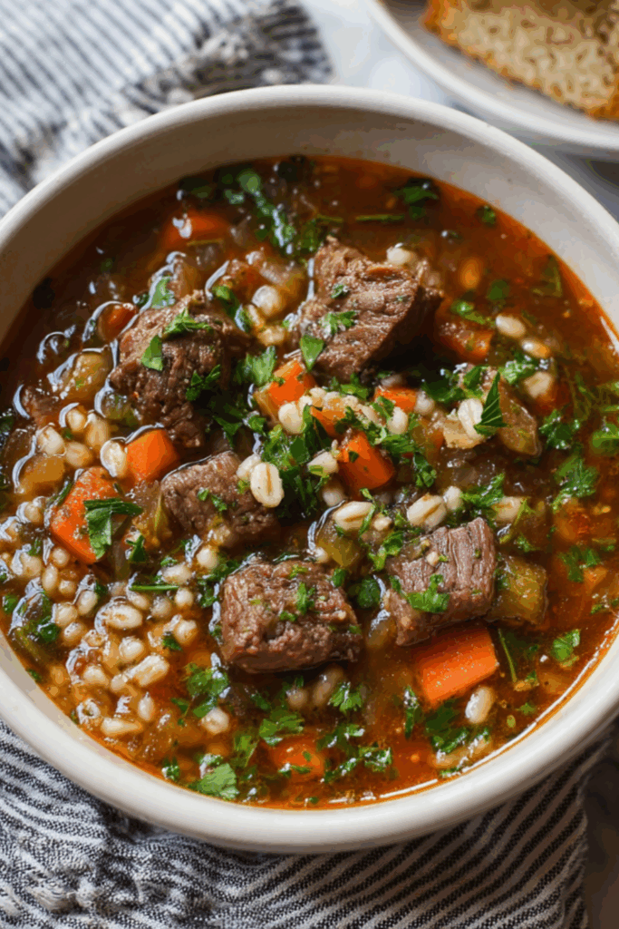 A hearty beef barley soup slow-simmered with tender beef, root veg, herbs, and chewy pearl barley — classic comfort in a bowl.