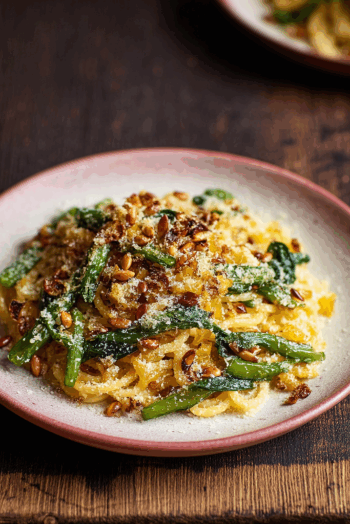 Hand-rolled spinach pasta tossed in a sweet, garlicky squash sauce with toasted seeds and Parmesan — rustic, cozy, and utterly satisfying.