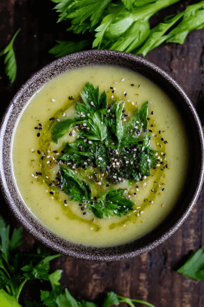 A light yet creamy celery soup with potatoes and herbs, blended to velvety perfection and topped with optional crispy celery leaves.