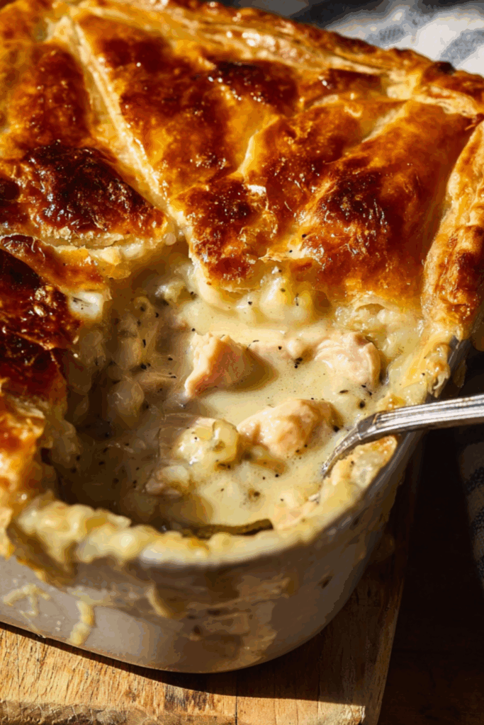 Creamy, cozy, golden-topped chicken and leek pie with a wine-and-thyme sauce and flaky puff pastry crust.