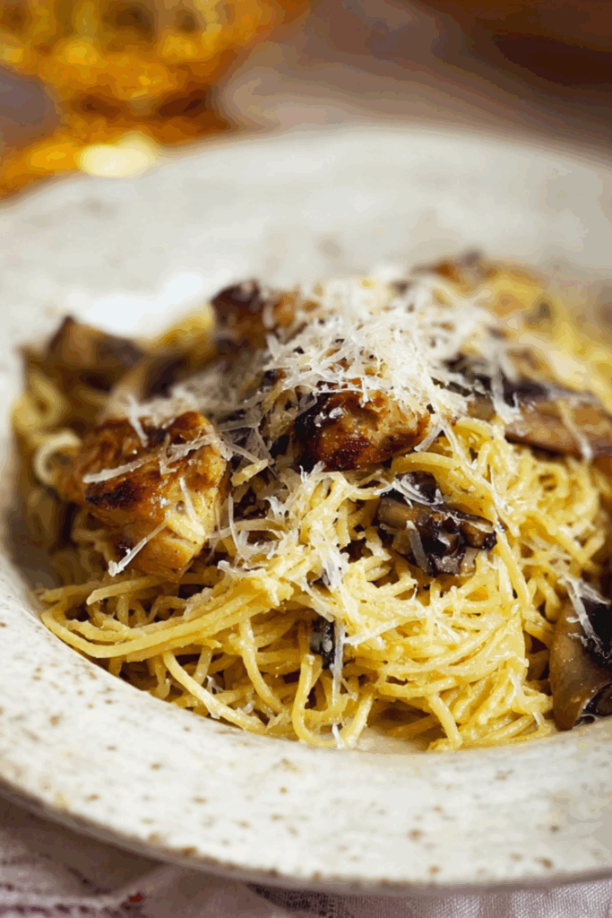 Creamy chicken and mushroom pasta bake with a golden Parmesan top and a hint of basil — rich, rustic and proper comforting.