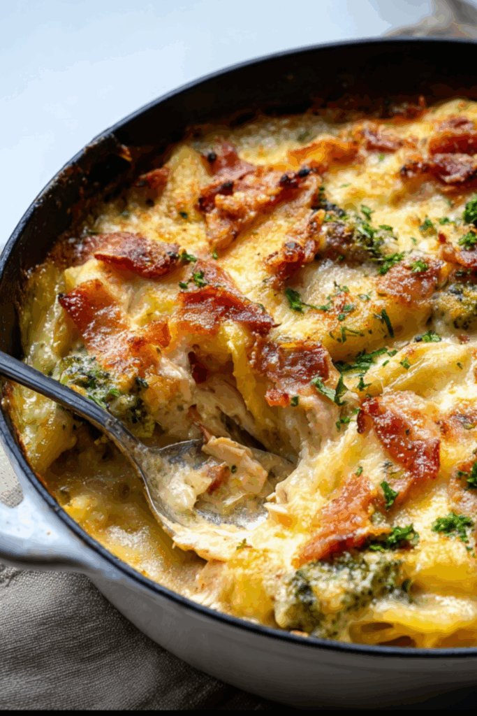 A cozy, cheesy chicken and broccoli pasta bake with a rich herb-laced sauce, crispy bacon, and melty mozzarella — the ultimate comfort bake.