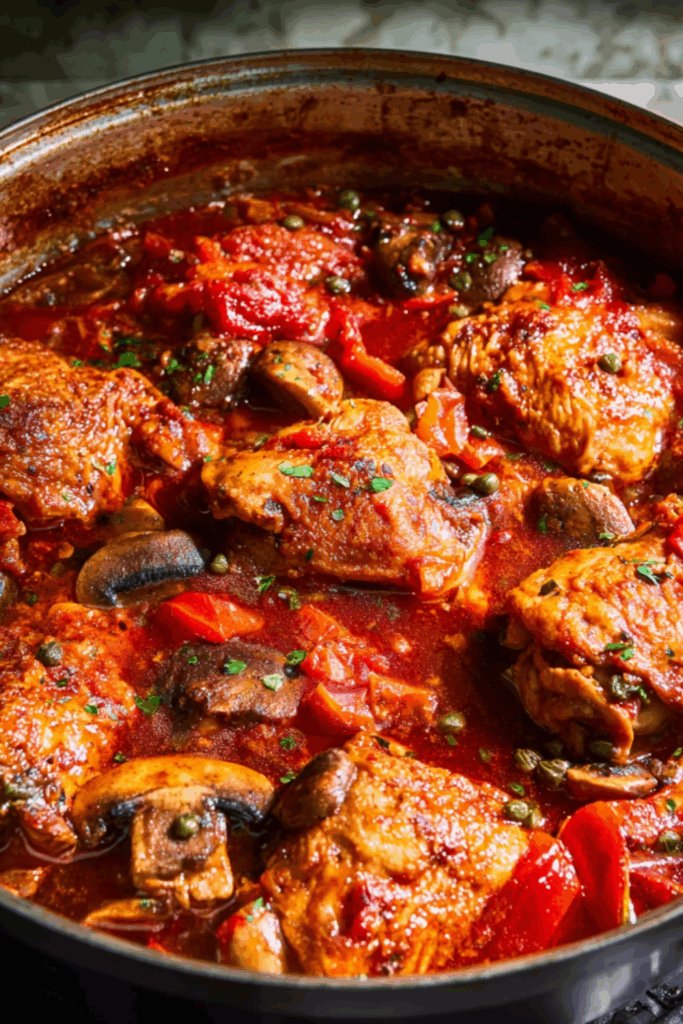 A slow-cooked Italian classic — tender chicken in a rich tomato and pepper sauce with a briny caper finish.