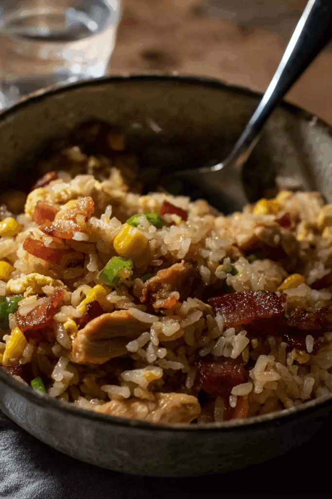 A fast, flavour-packed fried rice dish with golden chicken, crisp bacon, sweet veggies, and fluffy eggs all stirred into savoury perfection.