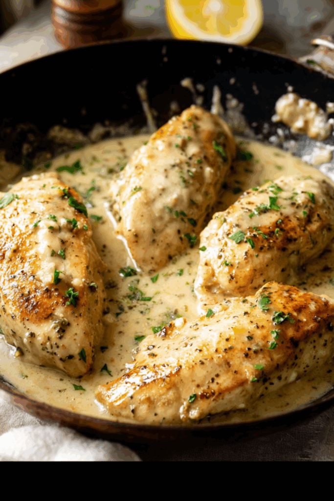 Creamy, dreamy, golden-seared chicken swimming in a buttery white wine sauce — elegant enough for guests, easy enough for Tuesday night.