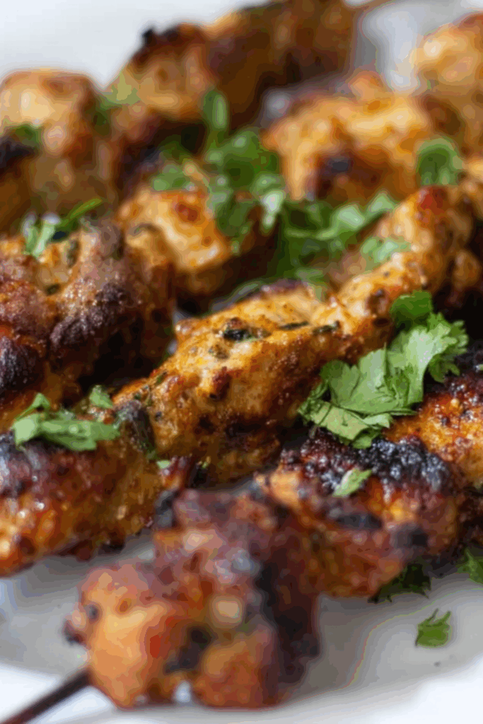 Thread the marinated chicken onto metal or soaked wooden skewers. Leave a little space between pieces so they cook evenly. No skewers? No drama — just lay them flat on a tray or grill rack.