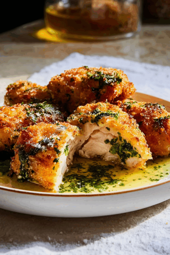 Set up a dredging station—flour, egg, and breadcrumbs. Dip each chilled chicken roll in flour, then egg, then breadcrumbs. Give it a good press so the crumbs really stick.