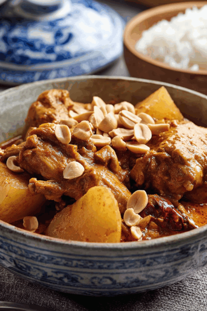 A rich, coconut-based Thai curry simmered with chicken, potatoes, peanuts, and fragrant spices — deeply warming and packed with flavour.