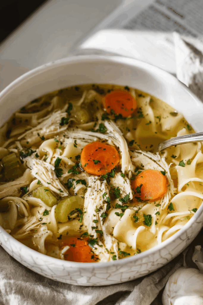 There’s something about chicken noodle soup that hits a little deeper than most comfort food. Maybe it’s the way it smells when it’s bubbling on the stove — that warm, savoury broth that somehow makes your kitchen feel safer. Or maybe it’s because we’ve all had a day, and this soup feels like it’s giving us a hug back.