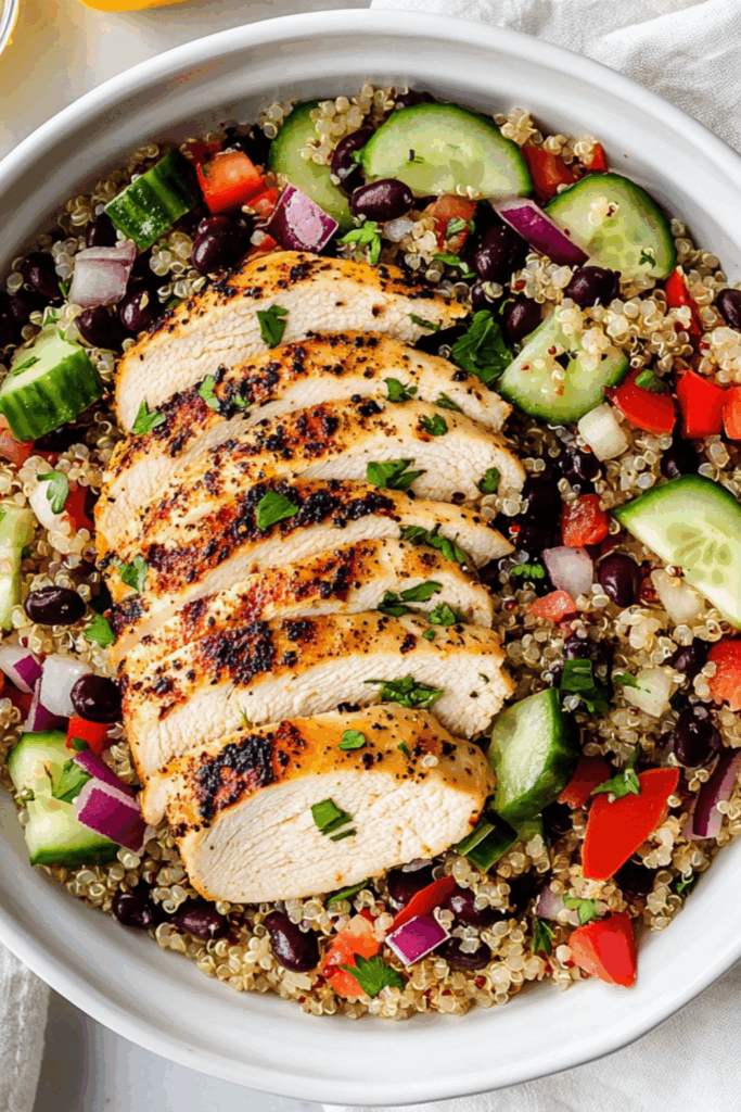 This bright and hearty quinoa salad is loaded with juicy spiced chicken, crisp veggies, and lemony dressing — a meal-prep hero and fridge-friendly lunch fave.