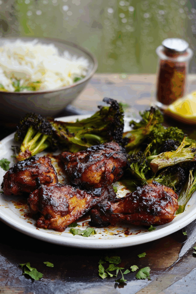 I usually throw this together the night before, tuck it in the fridge, and dream about it all day. By the time it hits the oven, the marinade’s worked its way right into every corner of the chicken, and the house starts to smell like I’ve opened a tiny takeaway out of my kitchen. The broccoli gets roasted until it’s got those little crispy bits — trust me, you won’t miss the naan if you don’t have any. But also, like… have naan.