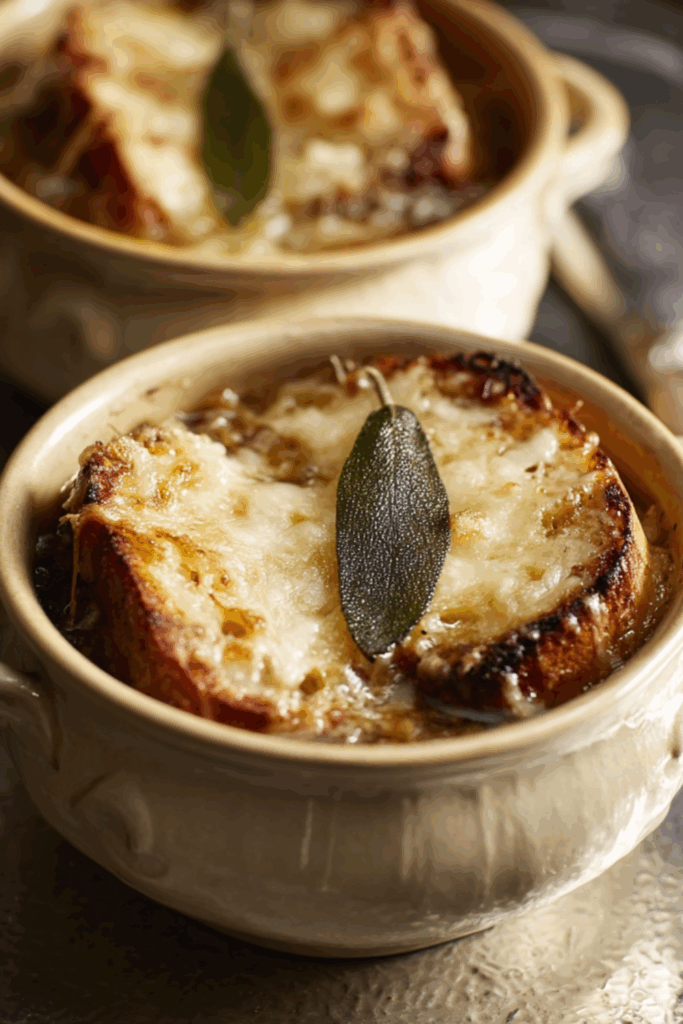 Deeply caramelised onions and leeks in a savoury broth, topped with cheesy toast and crispy sage — rustic, rich, and unapologetically comforting.