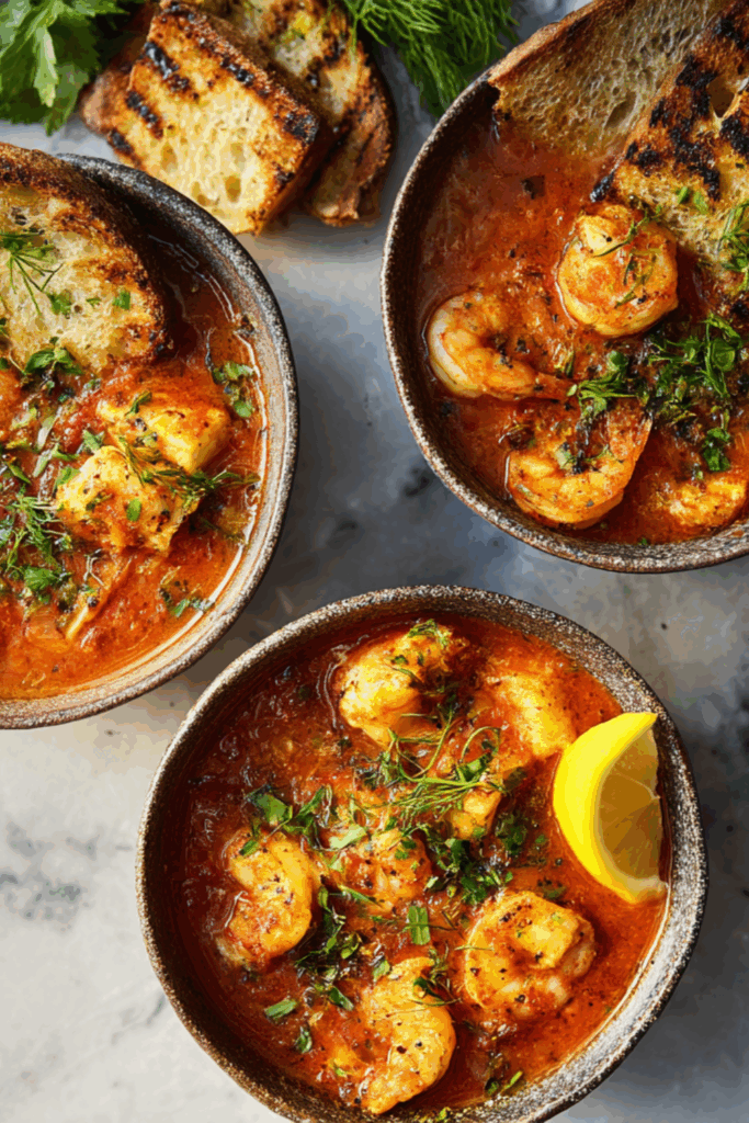 Roughly chop the salmon and halibut into chunky bites. After the 30-minute simmer, add both types of fish along with the prawns or langoustine tails. Cover and let it cook gently for another 10 minutes — just enough for the fish to go opaque and flaky, not overdone.