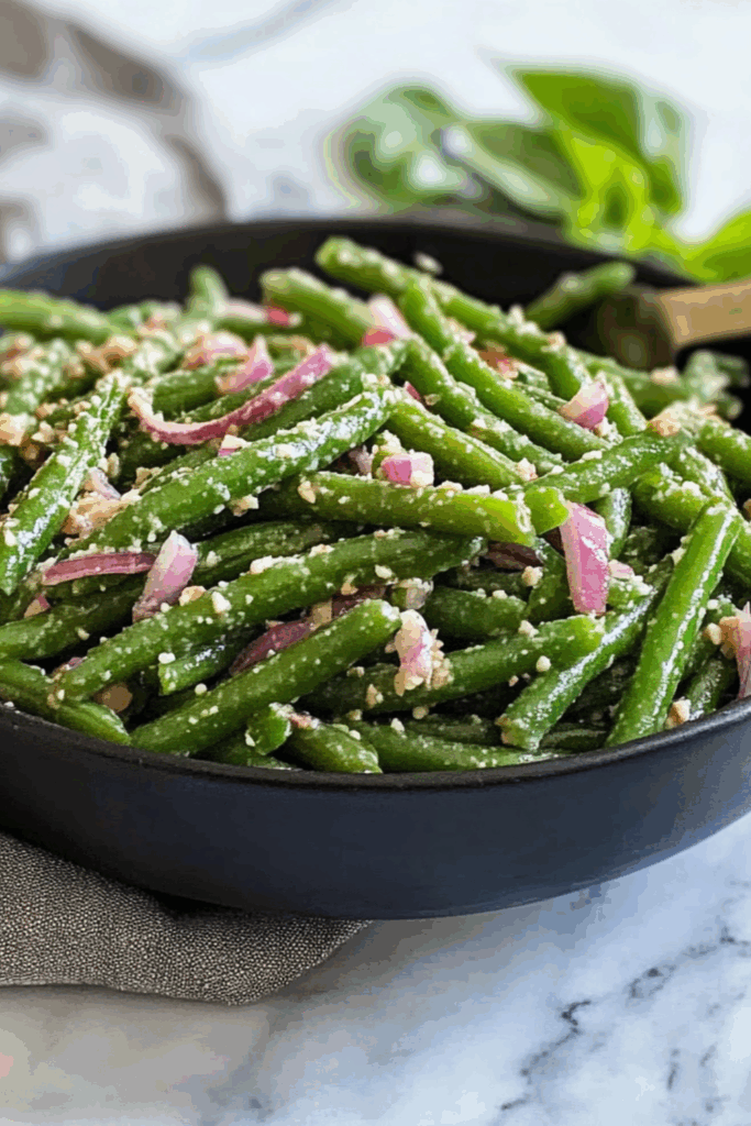 A bright, basil-packed green bean salad tossed with balsamic, red onion, and freshly grated Parmesan — quick, flavourful, and picnic-perfect.