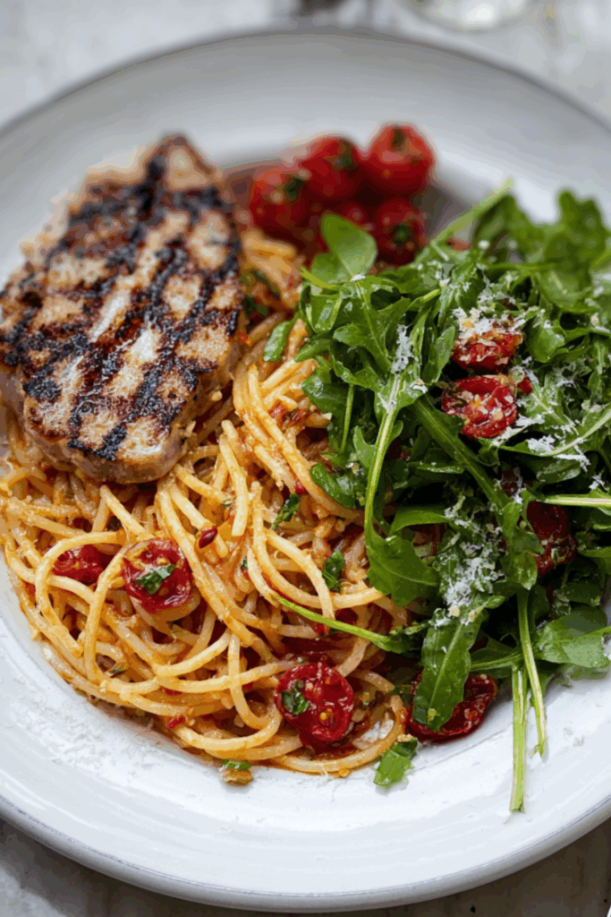 A quick and elegant dish of seared tuna on lemony tomato-spaghetti, finished with a zingy rocket and olive salad — light, fresh, and packed with flavour.