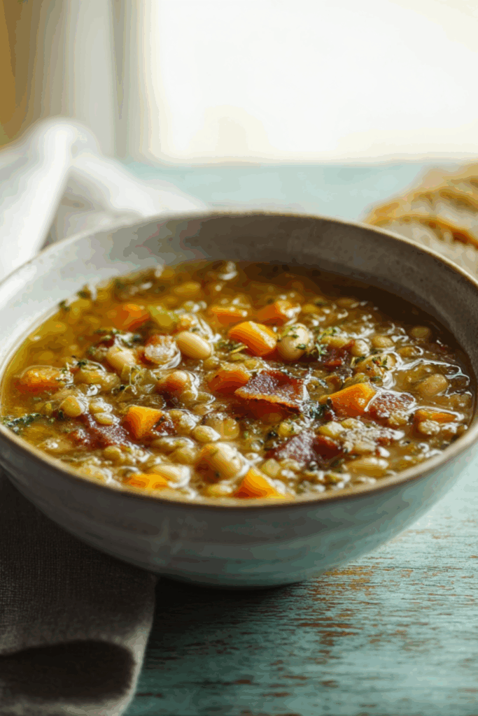 A hearty, rustic lentil soup with streaky bacon, soft veg, and creamy cannellini beans — finished with parsley and olive oil for warmth and depth.