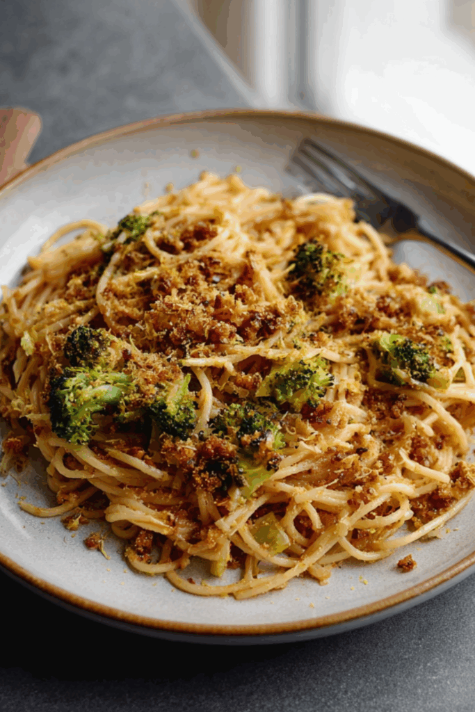 The best part? It’s quick. Like, “done before you’ve finished scrolling Netflix” quick. But somehow, it still feels like you’ve cooked. The breadcrumbs get golden and toasty, the garlic sings in the background, and the lemon zest on top just… lifts everything. It’s the kind of pasta that hugs you with one arm and high-fives you with the other.