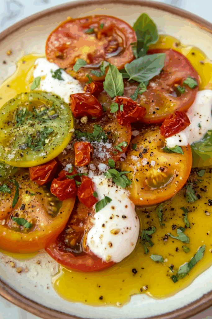 This salad is the one I make when I’ve got tomatoes too beautiful to ignore — the ones that look like a painter lost their mind at the farmer’s market. You don’t need anything fancy here. It’s all about letting the tomatoes show off and not getting in the way too much.