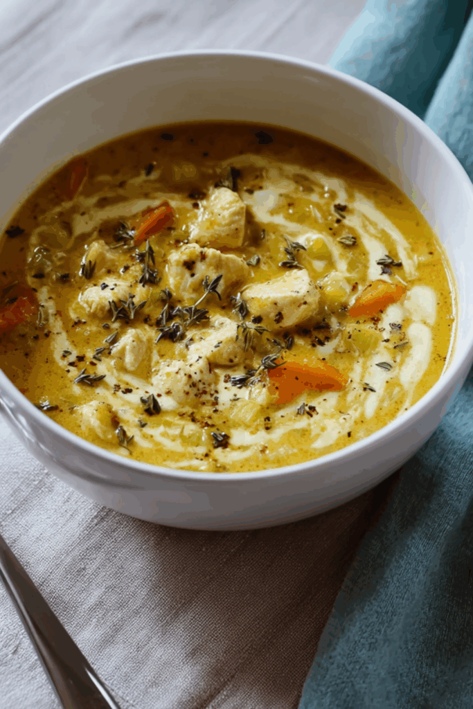 A warmly spiced, creamy chicken soup with curry, rice, and a surprise touch of apple — like chicken soup with a cheeky twist.