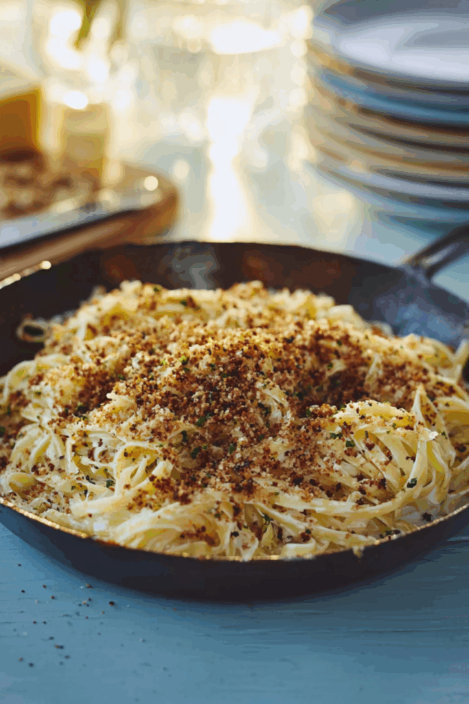 A cozy, creamy cheese pasta made with leftover bits and topped with garlicky walnut pangritata — crunchy, indulgent, and wildly satisfying.