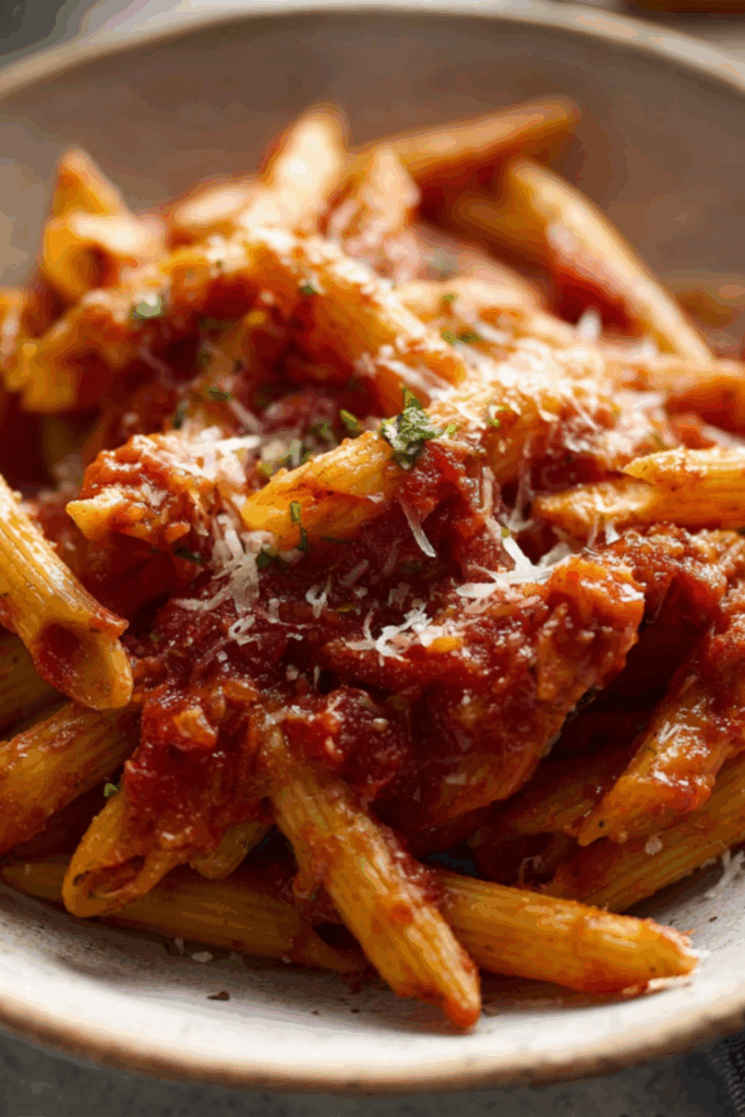 I first made this after a long day of nothing going to plan — burnt toast, soggy socks, that kind of Tuesday. I needed a dinner that didn’t require 42 ingredients or a calm spirit. Enter arrabbiata: hot oil, garlic, chili, tomatoes. Done. You simmer, boil, toss. And somehow, the world feels less annoying.
