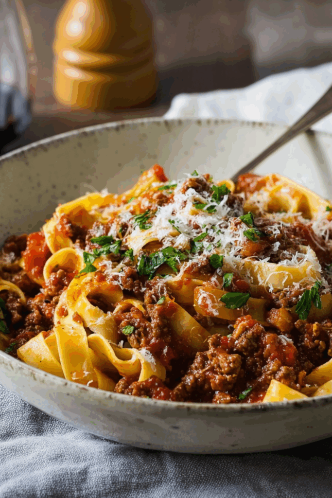 A rich, slow-cooked Bolognese sauce simmered with wine, milk, and pancetta — pure comfort served over hot pasta with a shower of Parm.