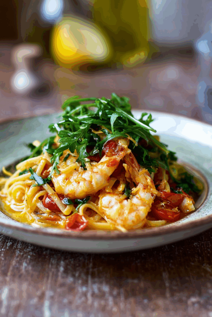 Sweet prawns, rich tomato-saffron sauce, fiery chilli, and fresh rocket tossed through silky linguine — an elegant, flavour-packed pasta that’s secretly simple.