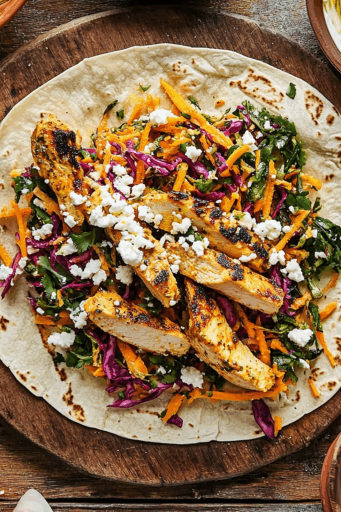 A punchy, colourful wrap stuffed with marinated chicken, crunchy slaw, a swirl of tahini yoghurt, and a little crumble of feta — fresh, fast, and full of flavour.