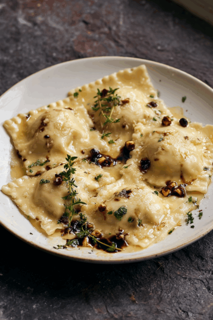 - Boil ravioli 3–4 minutes. Sauté in butter, oil, thyme, and a splash of pasta water.