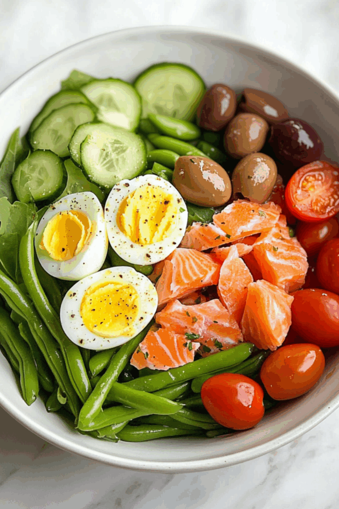 A French-inspired Nicoise salad made hearty with seared salmon, soft eggs, crisp veg, and a zingy lemon dressing — vibrant, flaky, and fresh.