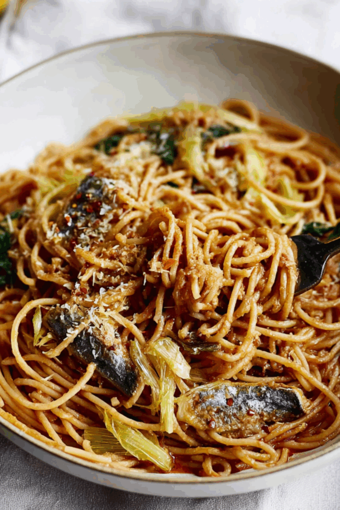 A fast, briny pasta with blended sardines, fresh lemon, fennel, and spinach—it’s bold, bright, and totally weeknight-friendly.