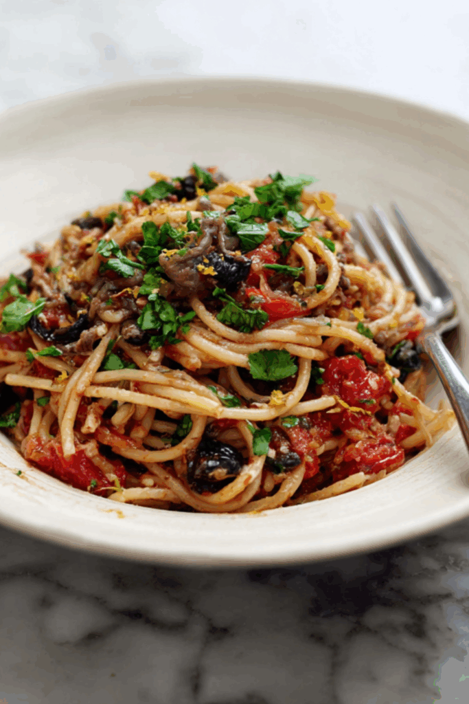 A quick, bold, pantry pasta with sardines, garlic, olives, and a rich tomato base — fast, salty, and totally satisfying.