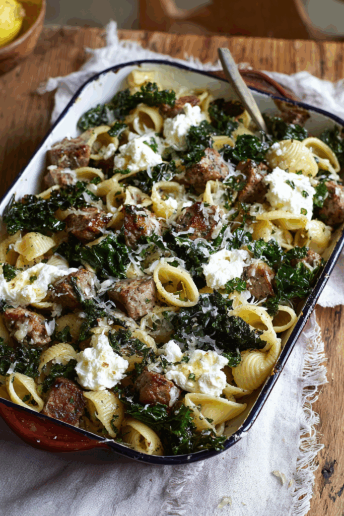 The sausages get all crispy and golden in the pan while the kale sneaks in like, “Hi! I’m healthy!” but it’s the cheese — good grief, the cheese — that pulls it all together. Ricotta for creaminess, pecorino for that salty, sharp edge. The lemon? That’s the secret. Brightens the whole thing like flicking on the lights.