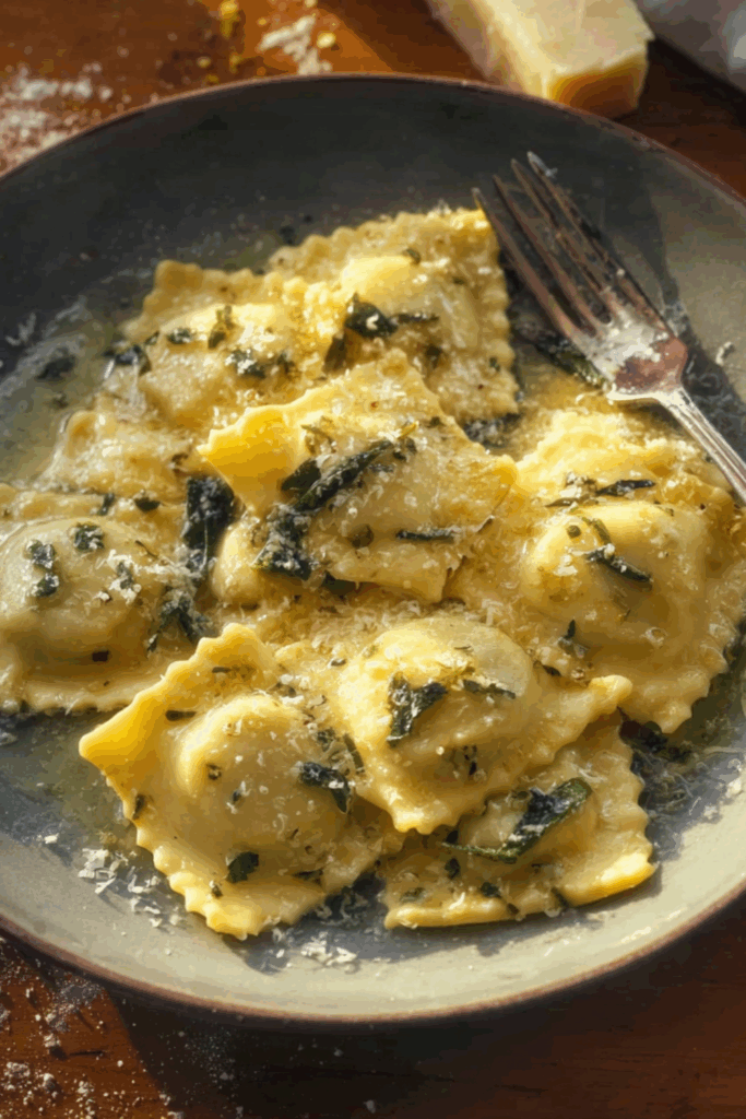 Bright, cozy, cheesy ravioli filled with potatoes and greens, tossed in crispy sage butter—homemade comfort, rustic and ridiculously good.