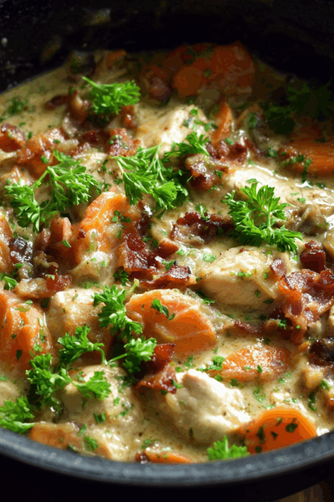 Tender chicken thighs slow-cooked with veg and crispy bacon in a creamy, herby sauce — rustic, hearty, and proper cozy.