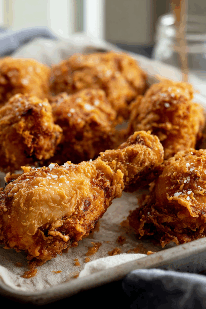 Crispy, golden Southern fried chicken soaked in buttermilk and hot sauce, with a craggy, seasoned crust that crackles with every bite.
