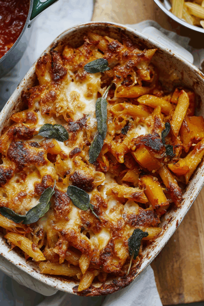 A rustic, comforting bake with sweet roasted squash, creamy ricotta, garlicky tomato sauce, and crispy sage leaves — the ultimate cozy pasta.