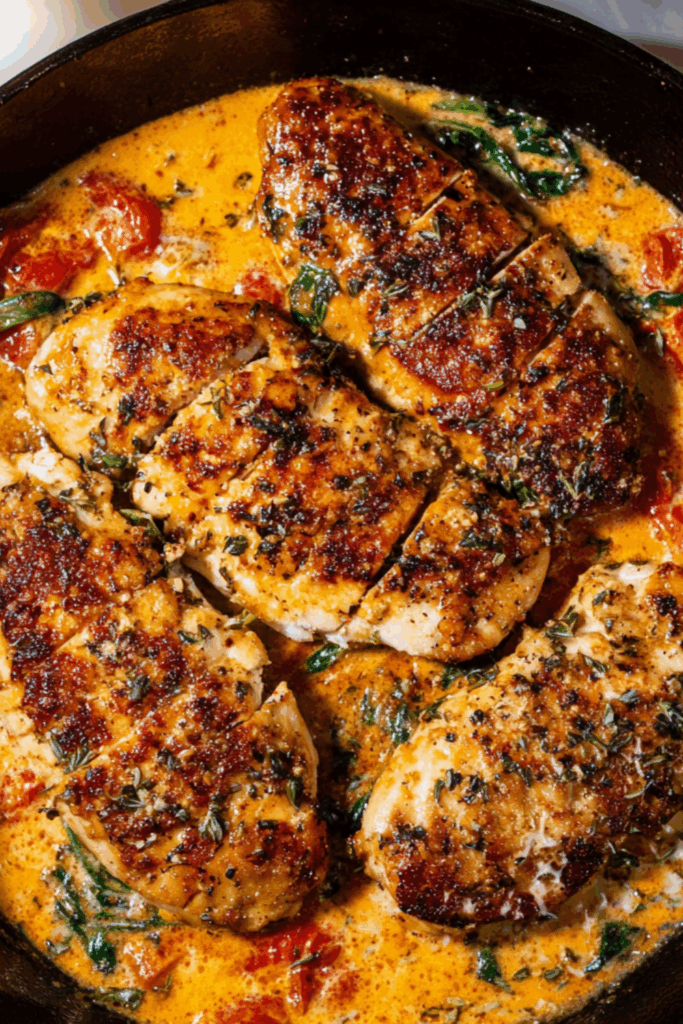 There’s something about Tuscan chicken that always brings me back to one particular summer. I was staying in a dusty little apartment in Florence — no air conditioning, just open windows and the scent of garlic and tomatoes drifting up from the streets. I wasn’t much of a cook then, still learning. I remember burning the garlic the first time I tried this dish… and the second. But when I finally got it right — golden chicken, jammy cherry tomatoes, creamy sauce that clung to every bite — it felt like home.