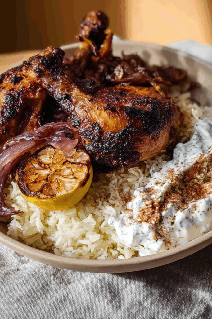 Golden roasted chicken smothered in creamy tzatziki, served over lemon-slicked onion rice — bold, fresh, and quietly brilliant.