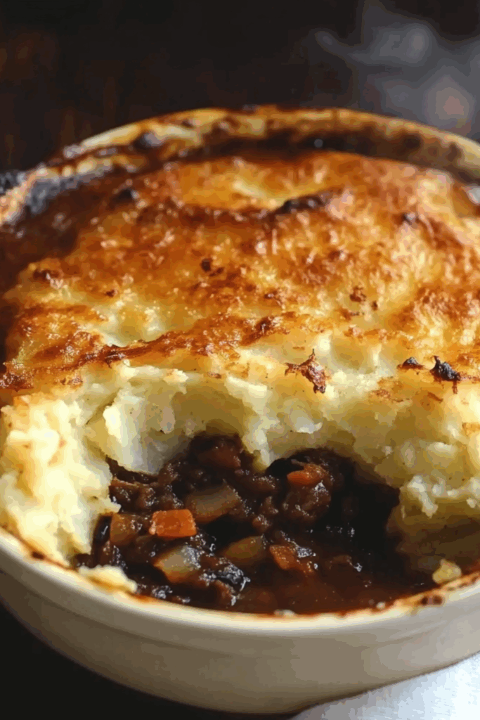 A cozy, savoury vegetarian cottage pie with a rich lentil-mushroom filling and fluffy mashed potato topping, baked until crisp and golden.