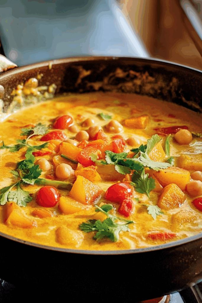 Add the coconut milk and drained chickpeas. Stir it all gently, then cover and let it simmer for about 30 minutes — until the squash is soft and everything smells glorious.
